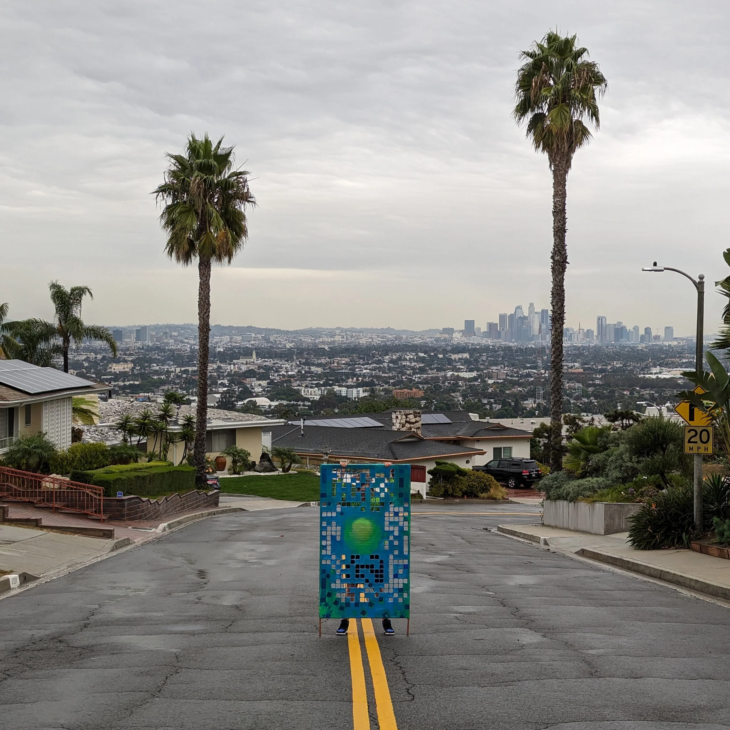 Acrylic, house paint and oil on canvas over aluminum frame, with plaster feet