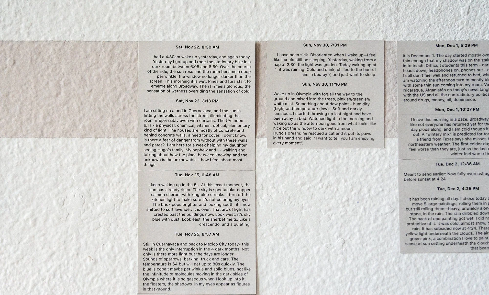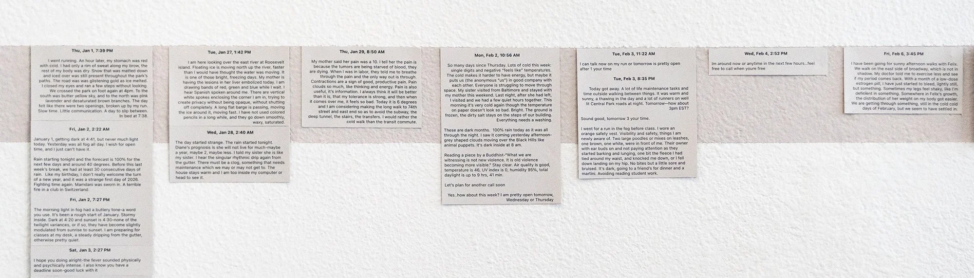 We met by chance at an art lecture in New York. We started talking and realized we lived near each other. Several years went by, and we never really kept in touch, but we didn’t not stay in touch either. Maybe there was something kindred in us but not explicit, except we are both artists who grew up in New York City and make work that cares about light. We reconnected on a hot summer day in August 2024 and again the following summer. In the fall, we began a collaboration at a distance over the dark months, using text message as the most expedient medium.