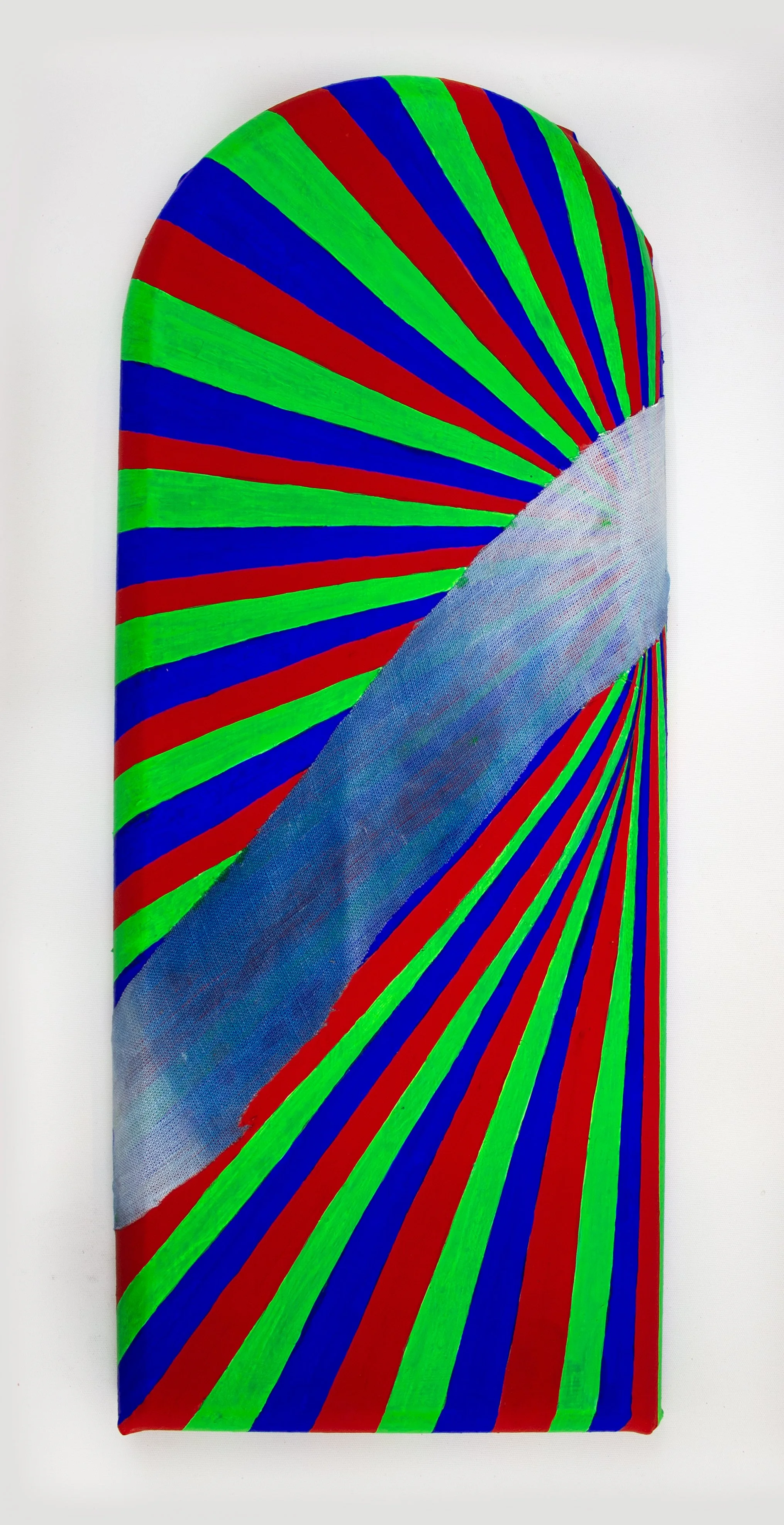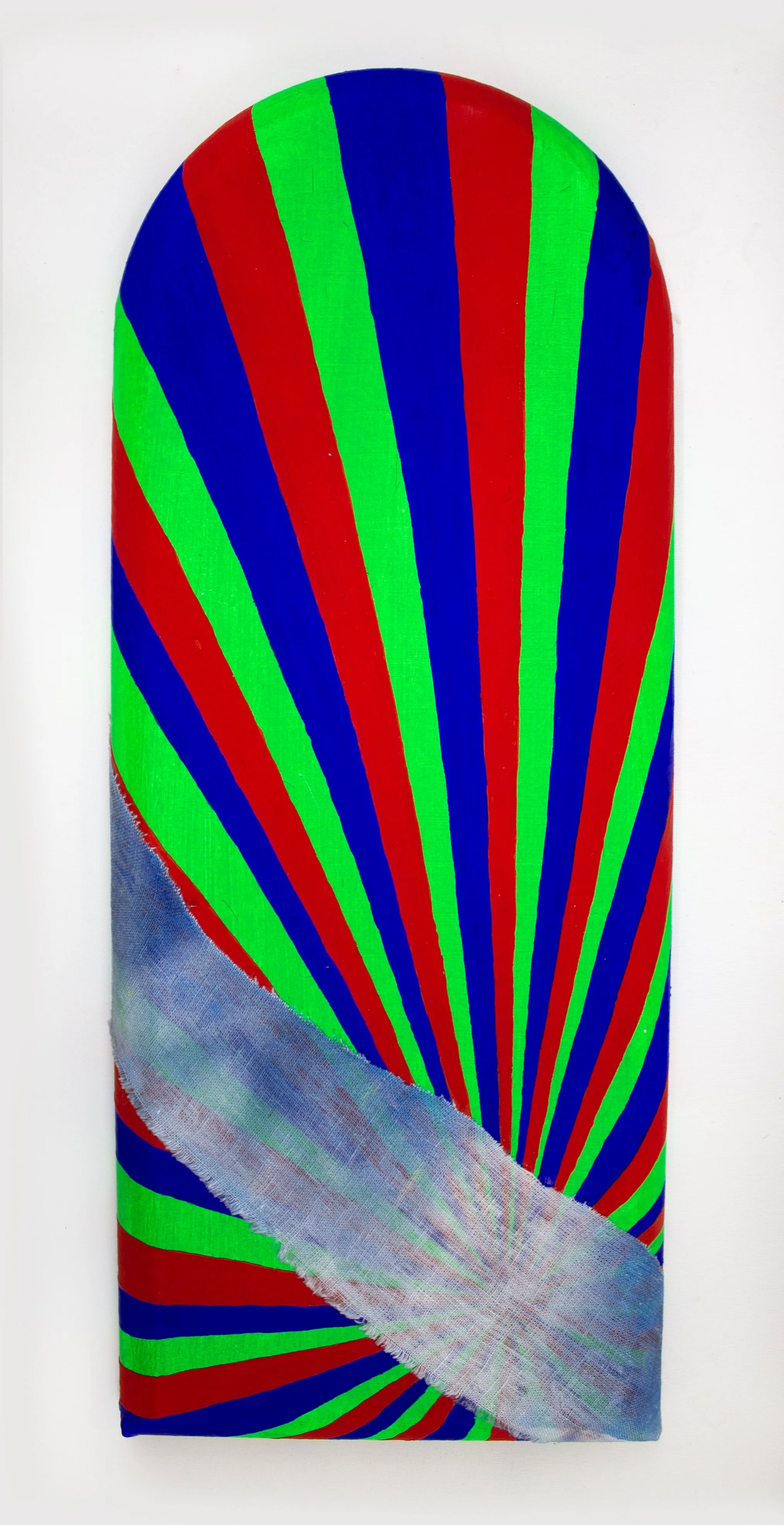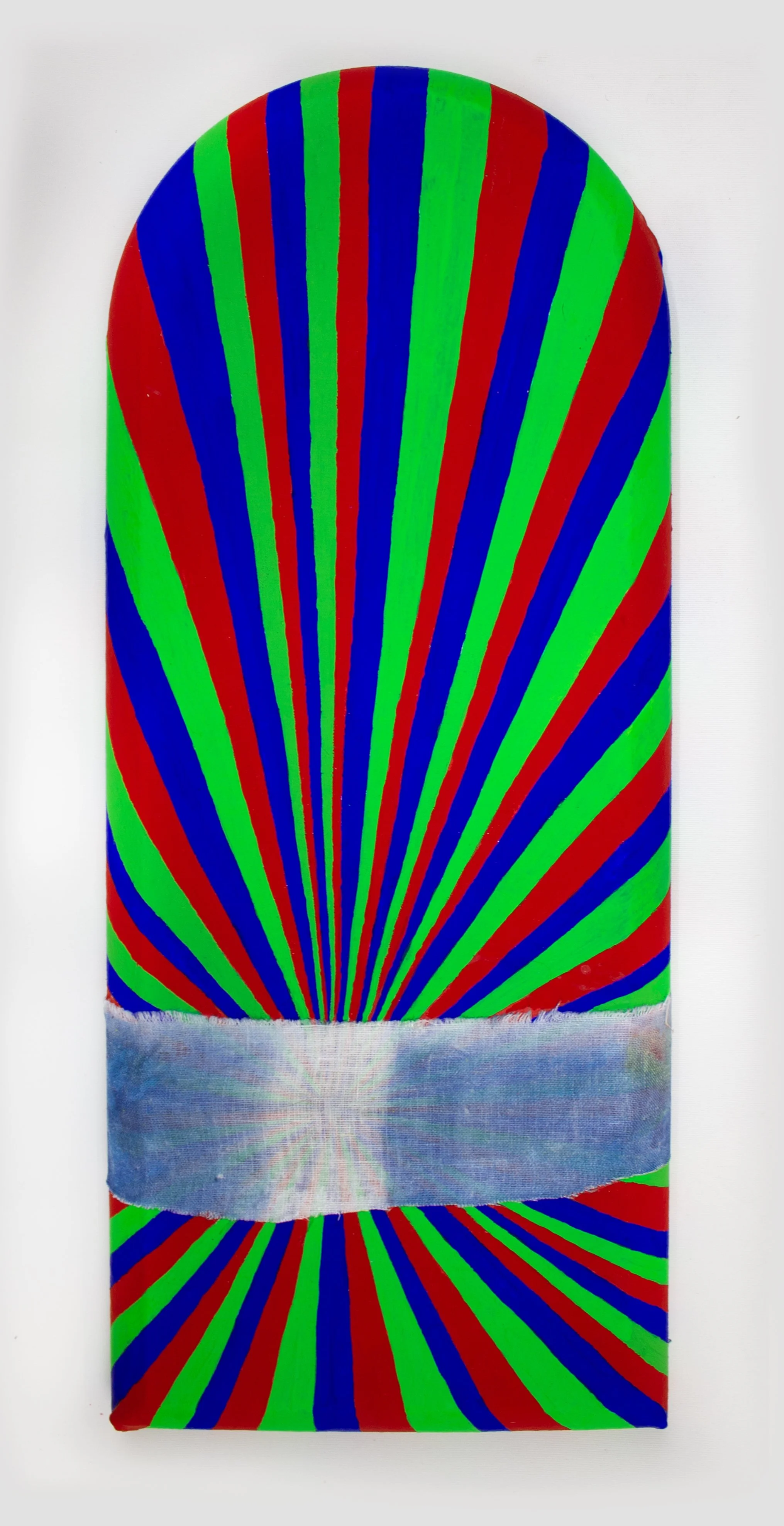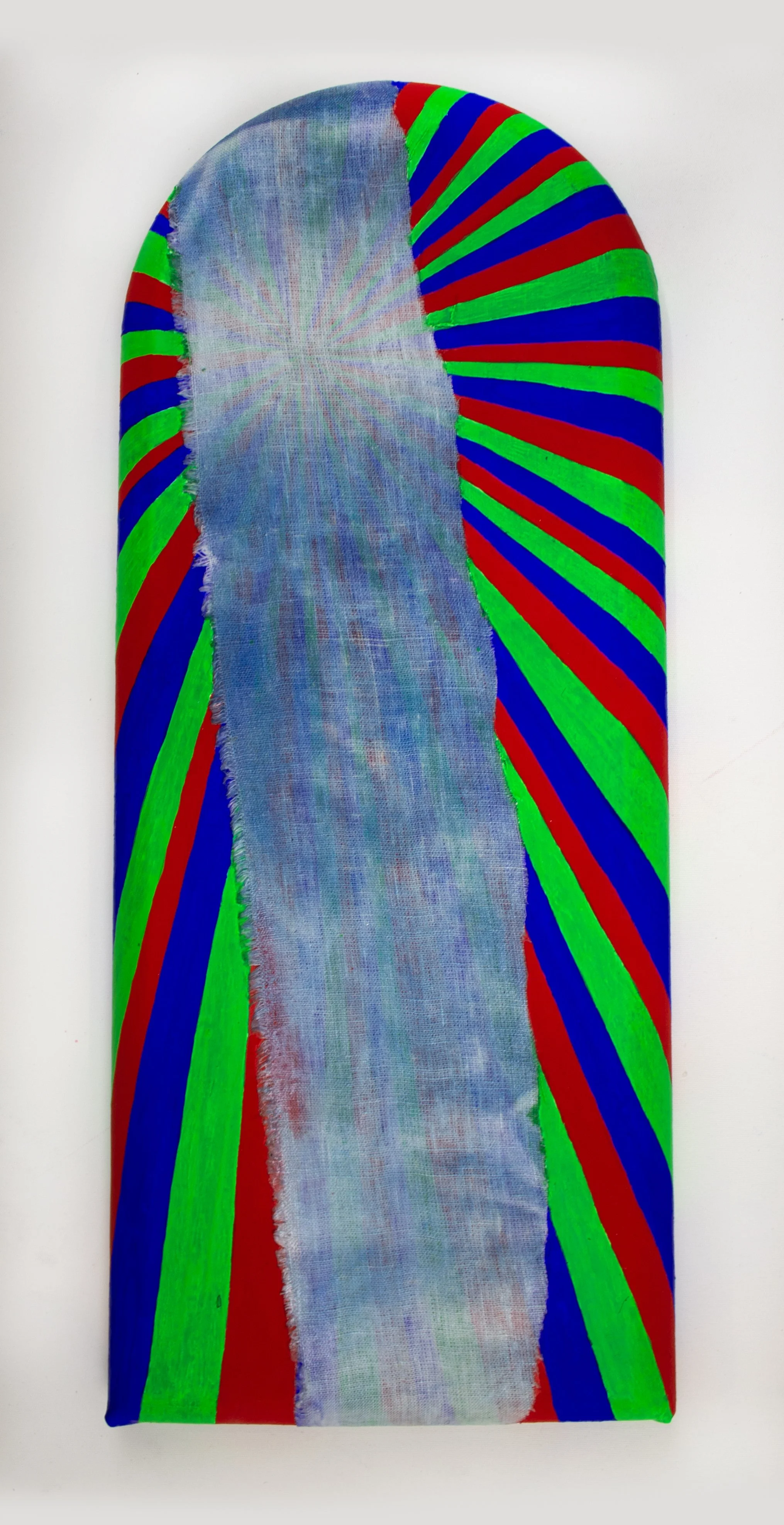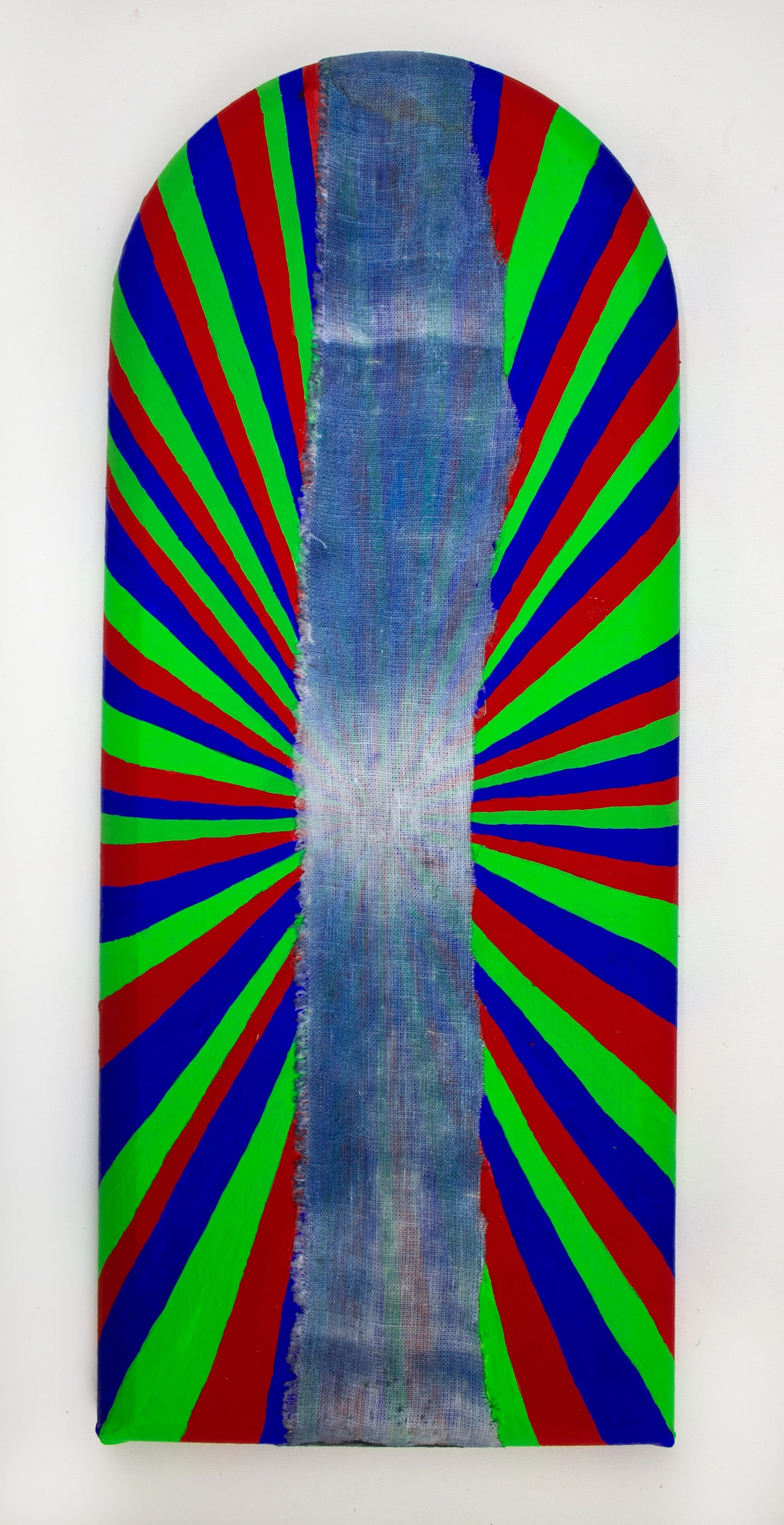 The small arched works came about in the following weeks while contemplating the representation of light using paint. Bands of red, green, and blue—the three primary colors in light mixing—are painted a top canvases the shape of Marquand Chapel’s windows. The colors vibrate beside each other, making them hard to look at—and yet, if one shifts their gaze immediately to a cyanotype, a prismatic afterimage appears on the surface of the print. There are all the colors in the white light.