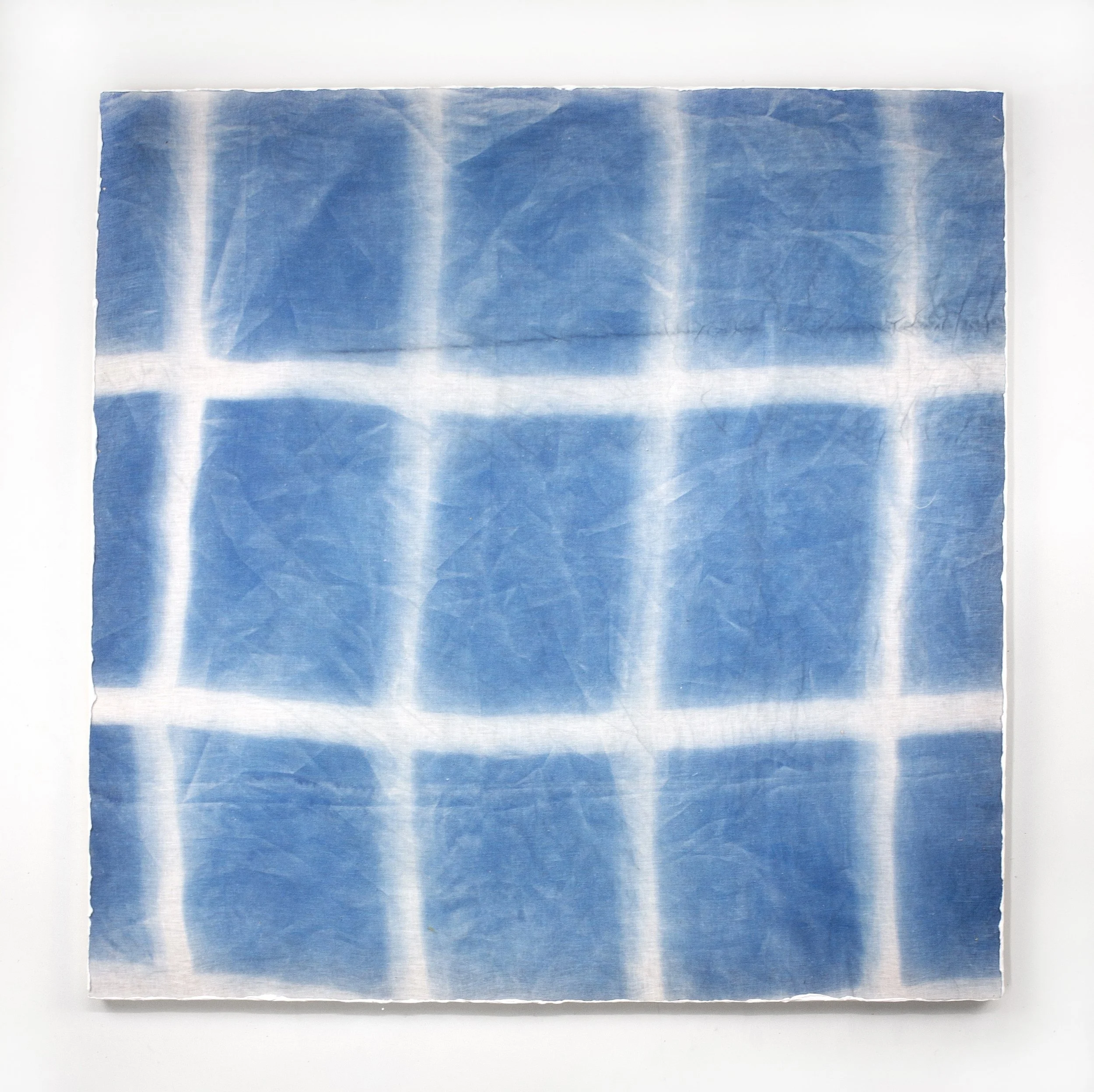 The prints are made on linen that has been photosensitized with two iron salts: ferric ammonium citrate (which is light sensitive) and potassium ferricyanide. After the exposure, the linen is stretched onto wooden frames, and in some cases sized with rabbit skin glue. The edges of the prints are built up with gesso and marble dust. Without disrupting the sun print, these applications make the surfaces taut and the edges hard like the architecture the light has passed through.